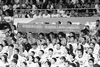 外卖员在“浙BA”现场为柯桥队得分欢呼。